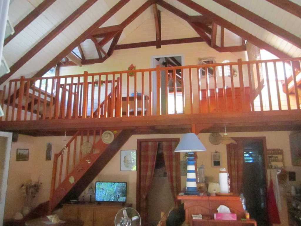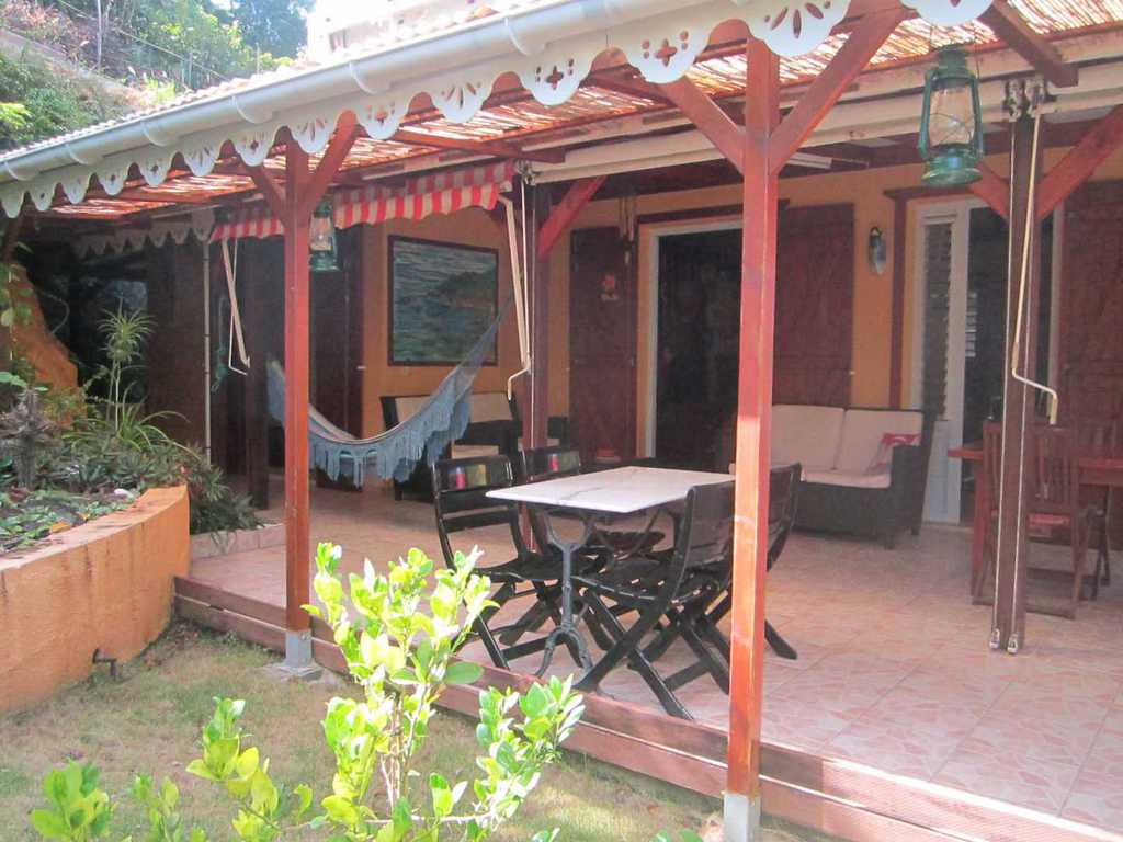 Cette maison individuelle, située à moins de 10 minutes du bourg et des plages, offre une grande terrasse extérieure.
